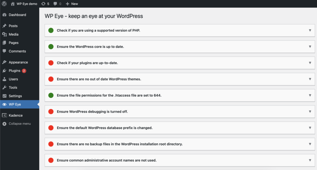 This plugin checks if your WordPress installation is secure. It checks basic rules, inspired by Wazuh policies.